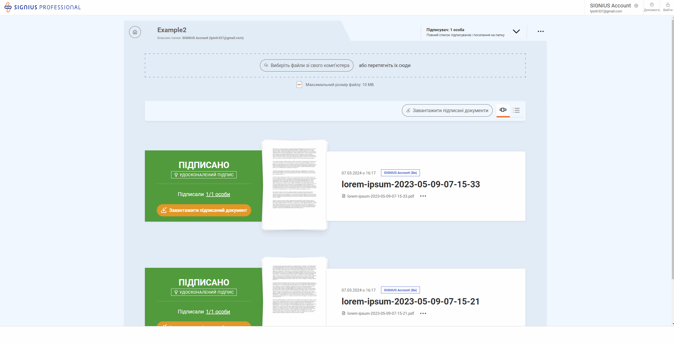 Ви також можете завантажити всі підписані документи в даній папці одночасно. Перебуваючи в папці, натисніть кнопку "Завантажить підписані документи", розташовану праворуч над документами.